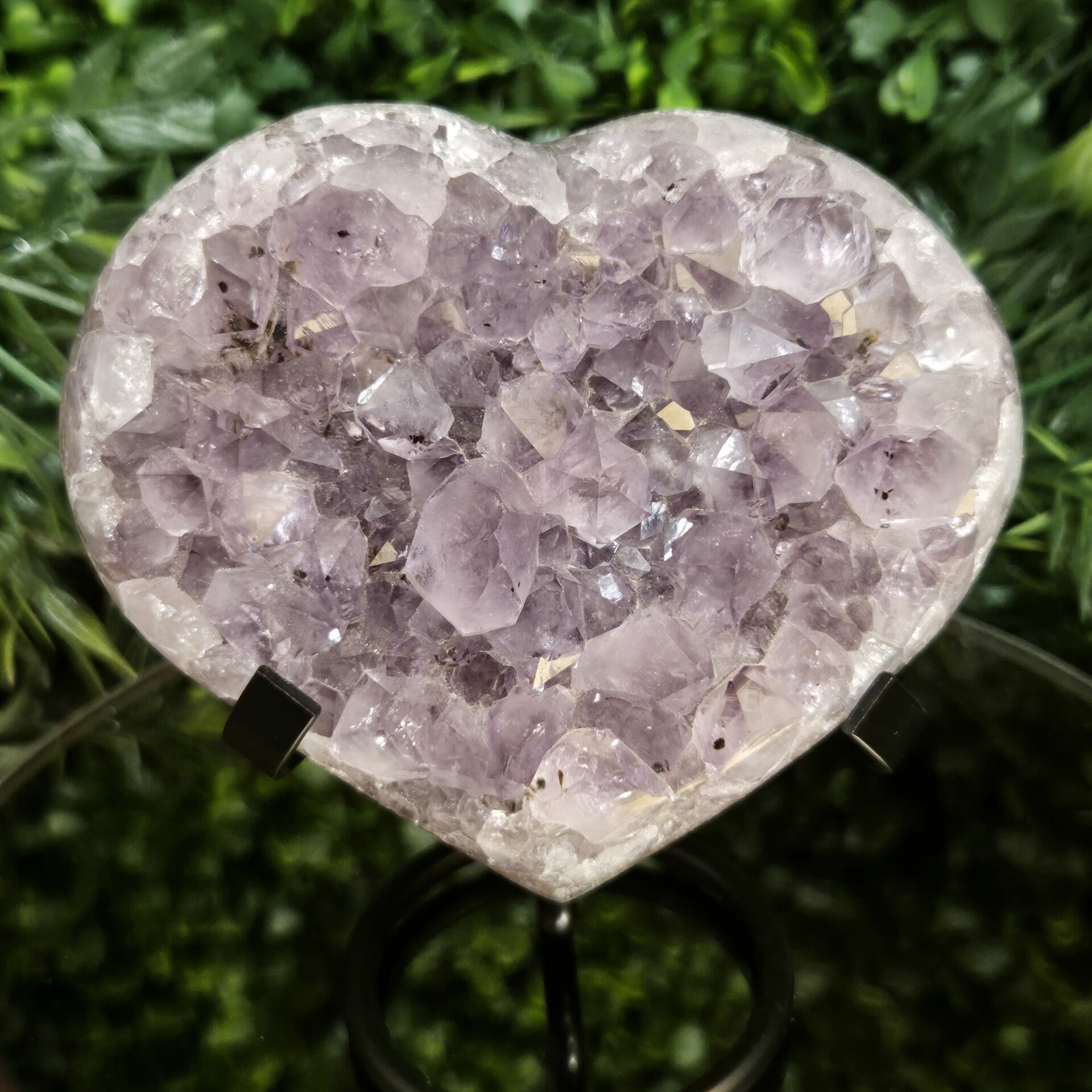 Dit prachtige Amethist hart op een zwarte standaard heeft een lichte paarse kleur.