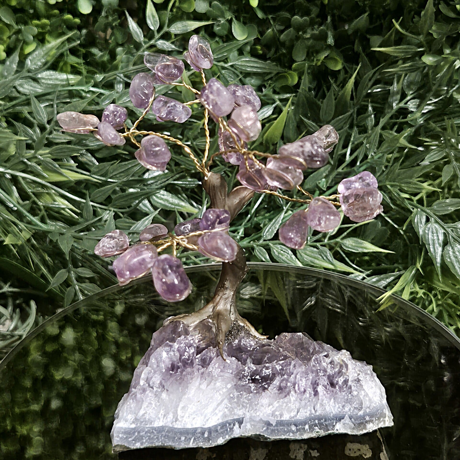 Edelsteen boom met amethist trommelsteentjes als blaadjes. De boom is ongeveer 13x11 cm en weegt 298 gram.