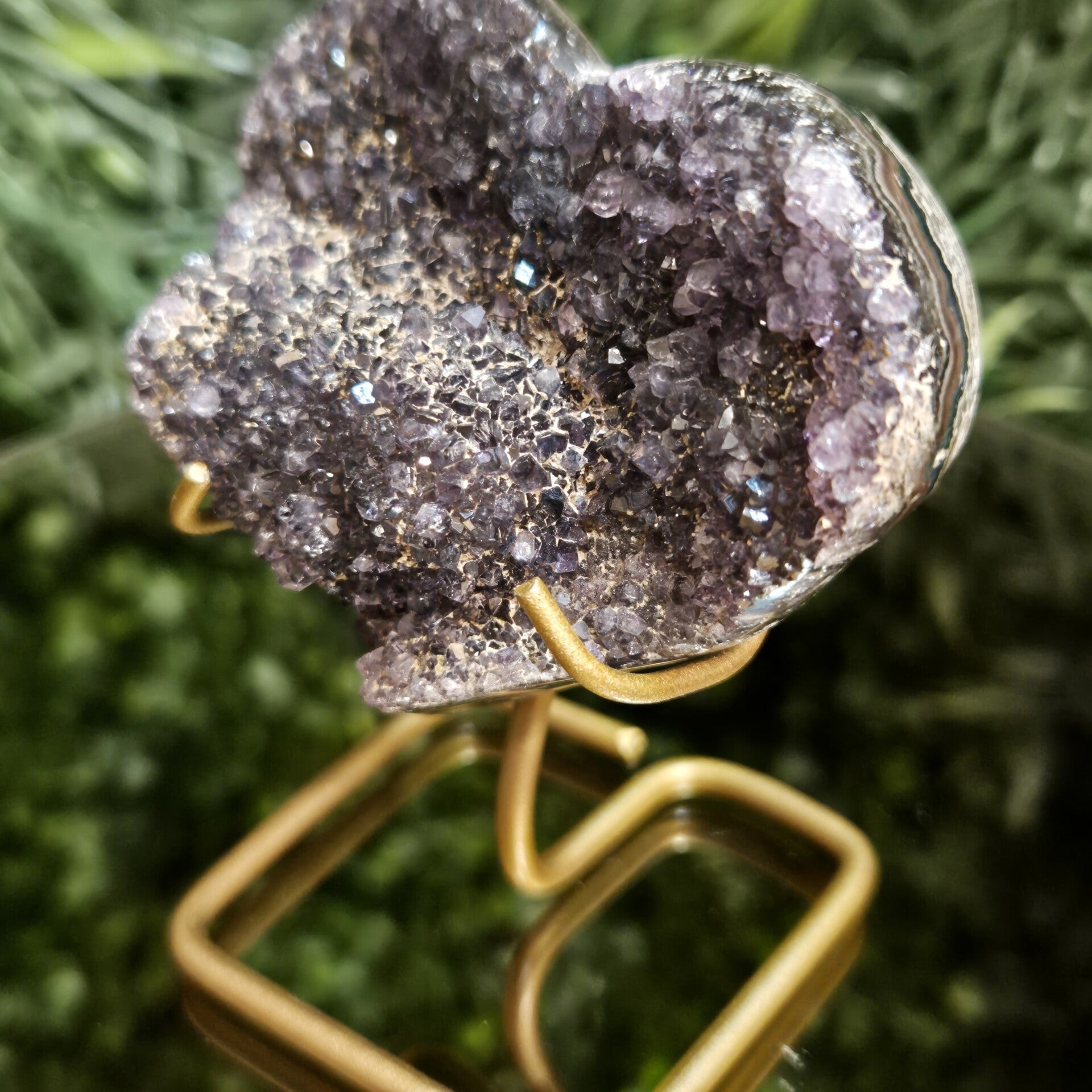 Dit prachtige Amethist hart op goudkleurige standaard heeft een hele mooie donkere kleur die valt te omschrijven als donkergrijs met een vleugje paars eroverheen. Om de buitenzijde loopt een hele mooie agaat band.