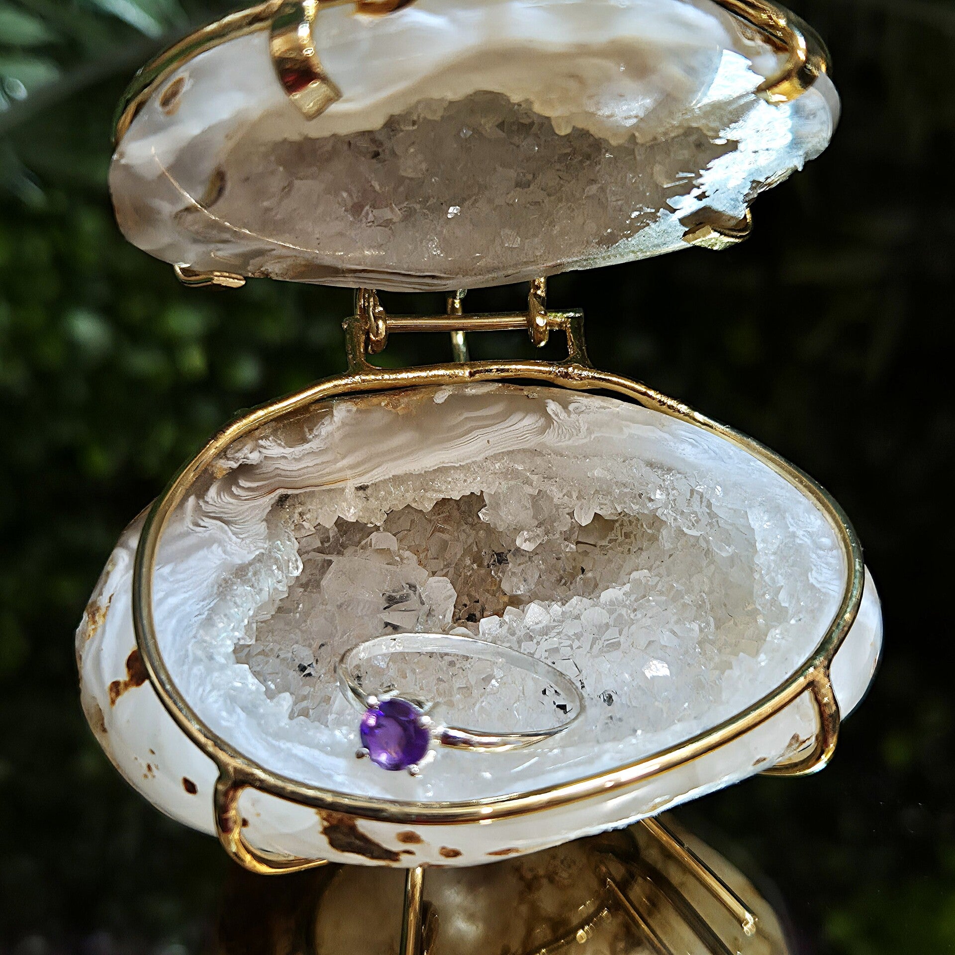 Prachtig juwelen doosje gemaakt van een Agaat Geode met goudkleurig beslag en pootjes.