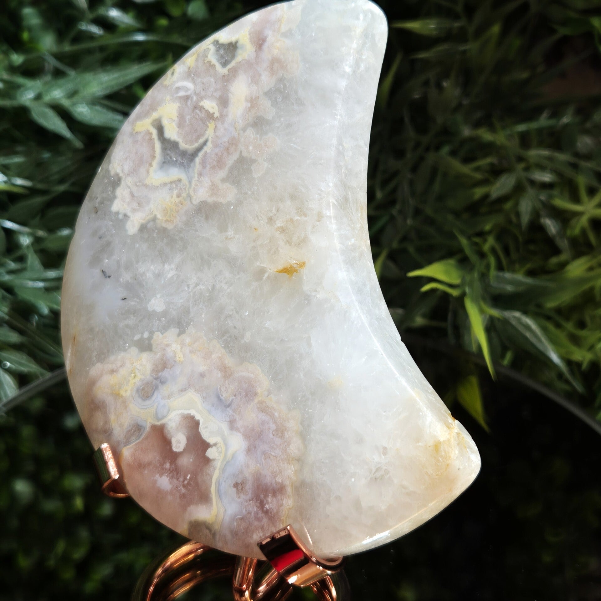 Prachtige Bloemagaat maan op rose gouden standaard.