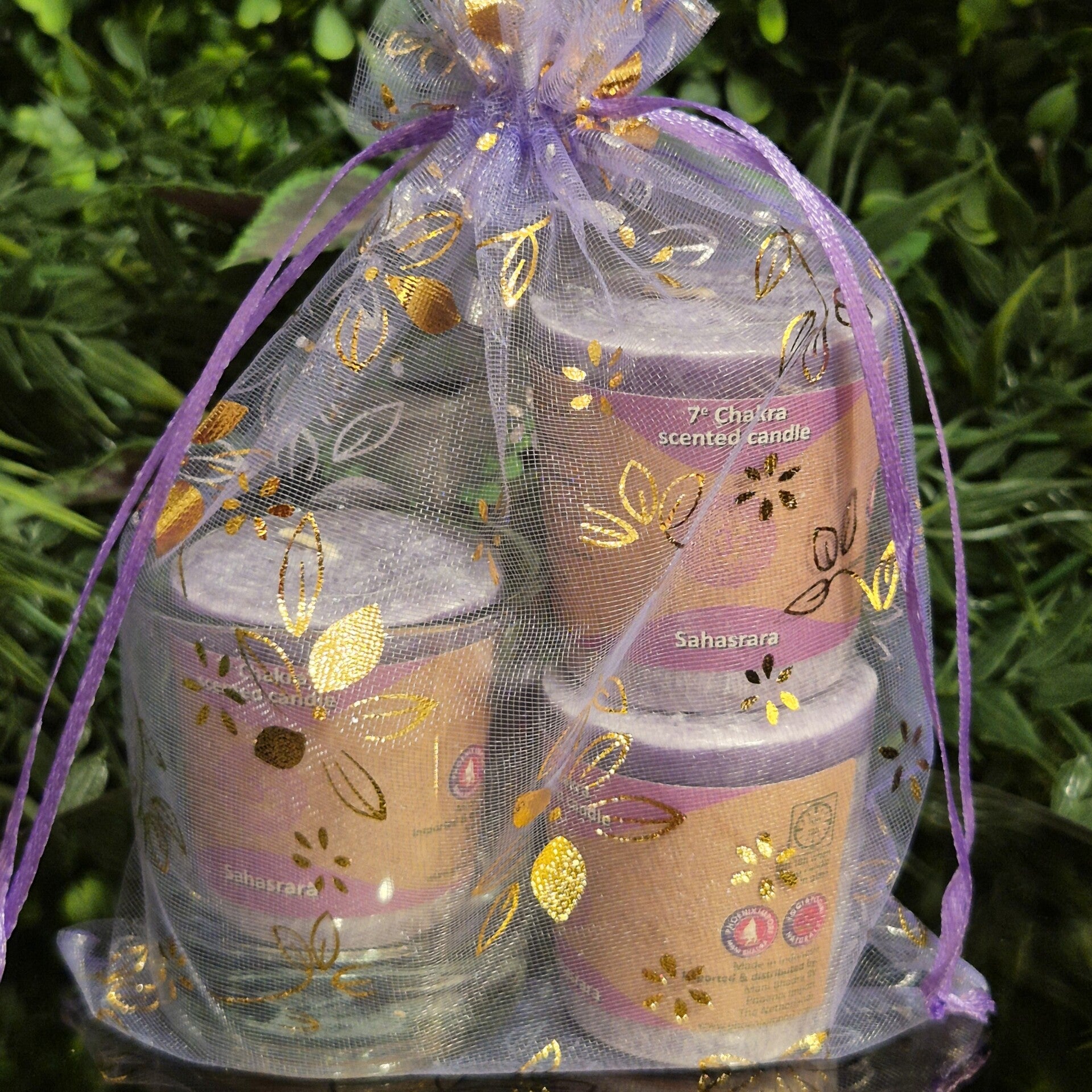 Geurkaarsen set van 3 kaarsen met een glazen houder. Deze set is samengesteld voor de 7e Chakra, Sahasrara. De combinatie bestaat uit de geuren patchouli, labdanum en frankincense.