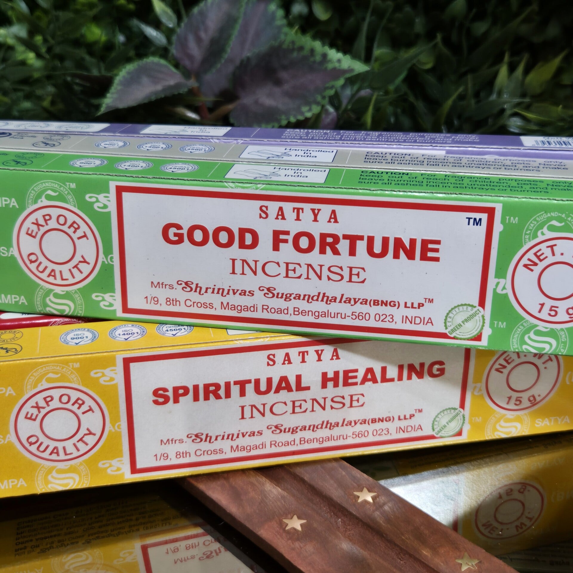 Een wierook cadeauset bestaande uit Satya Wierook en een houten wierook brander met een Boeddha afbeelding.