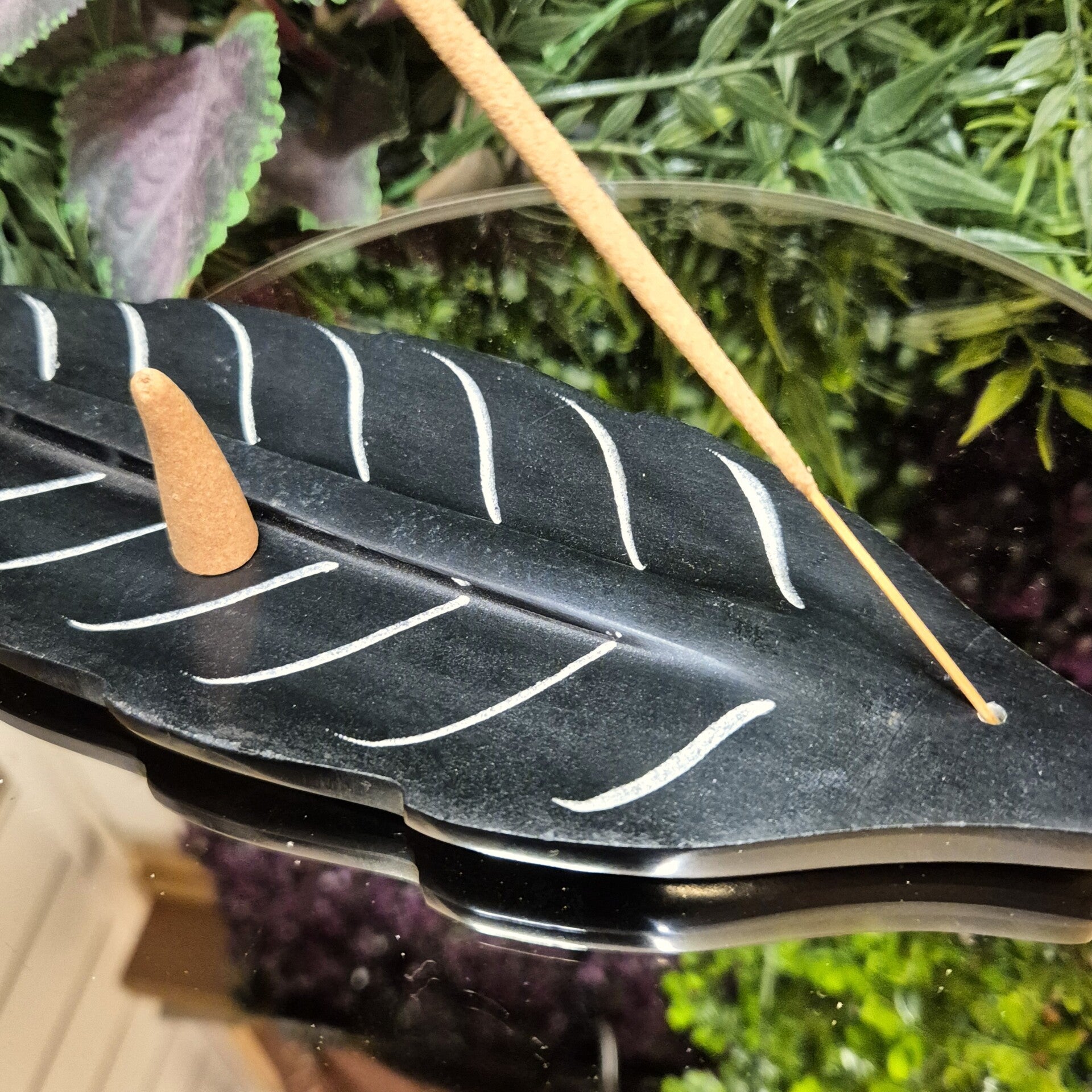 Stijlvolle wierookbrander in de vorm van een blad, vervaardigd uit gepolijst zwart zeepsteen. Deze elegante houder is geschikt voor zowel wierookstokjes als wierookkegels.