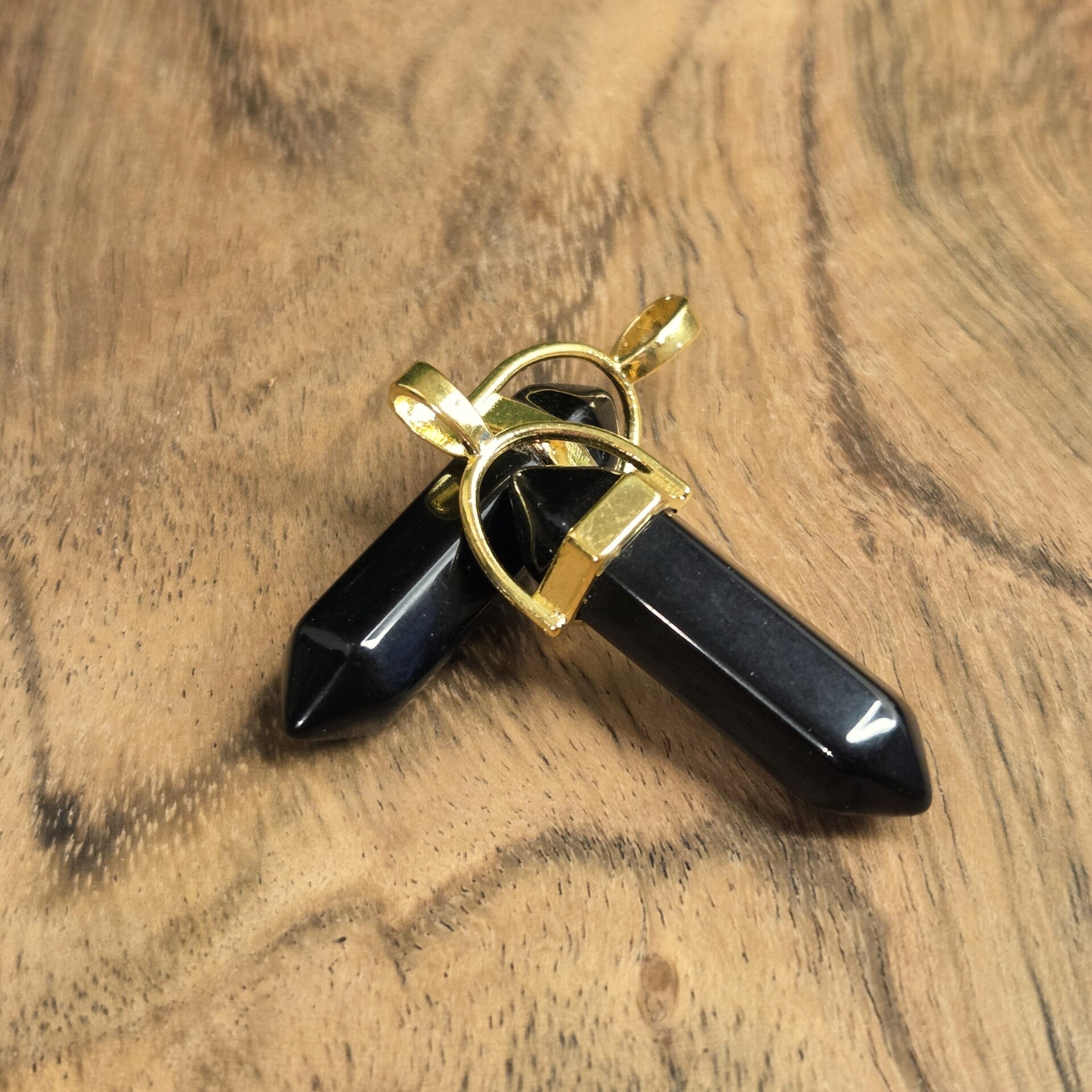 Dubbeleinder hanger van Obsidiaan (ca. 40 mm), afgewerkt met goudkleurig beslag.